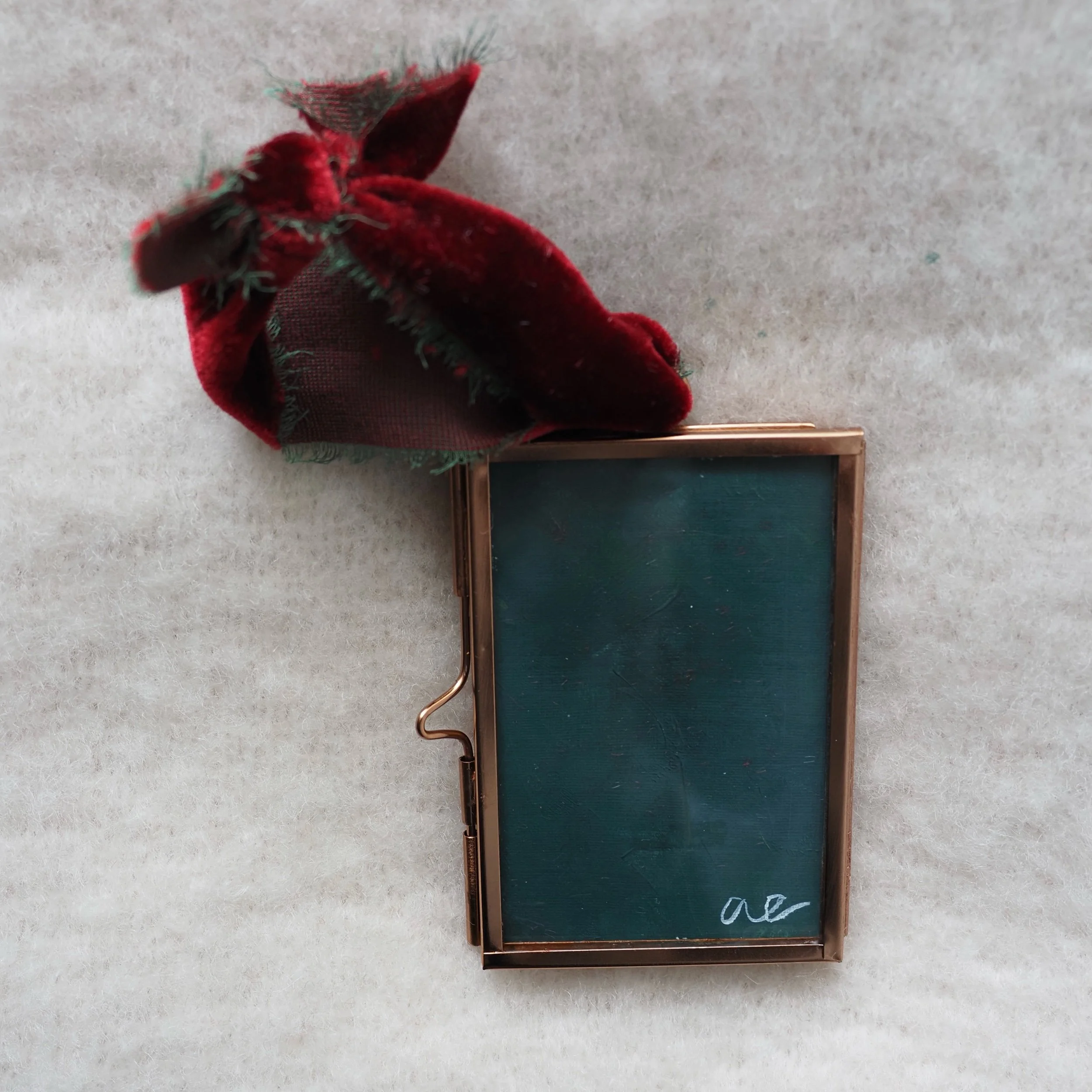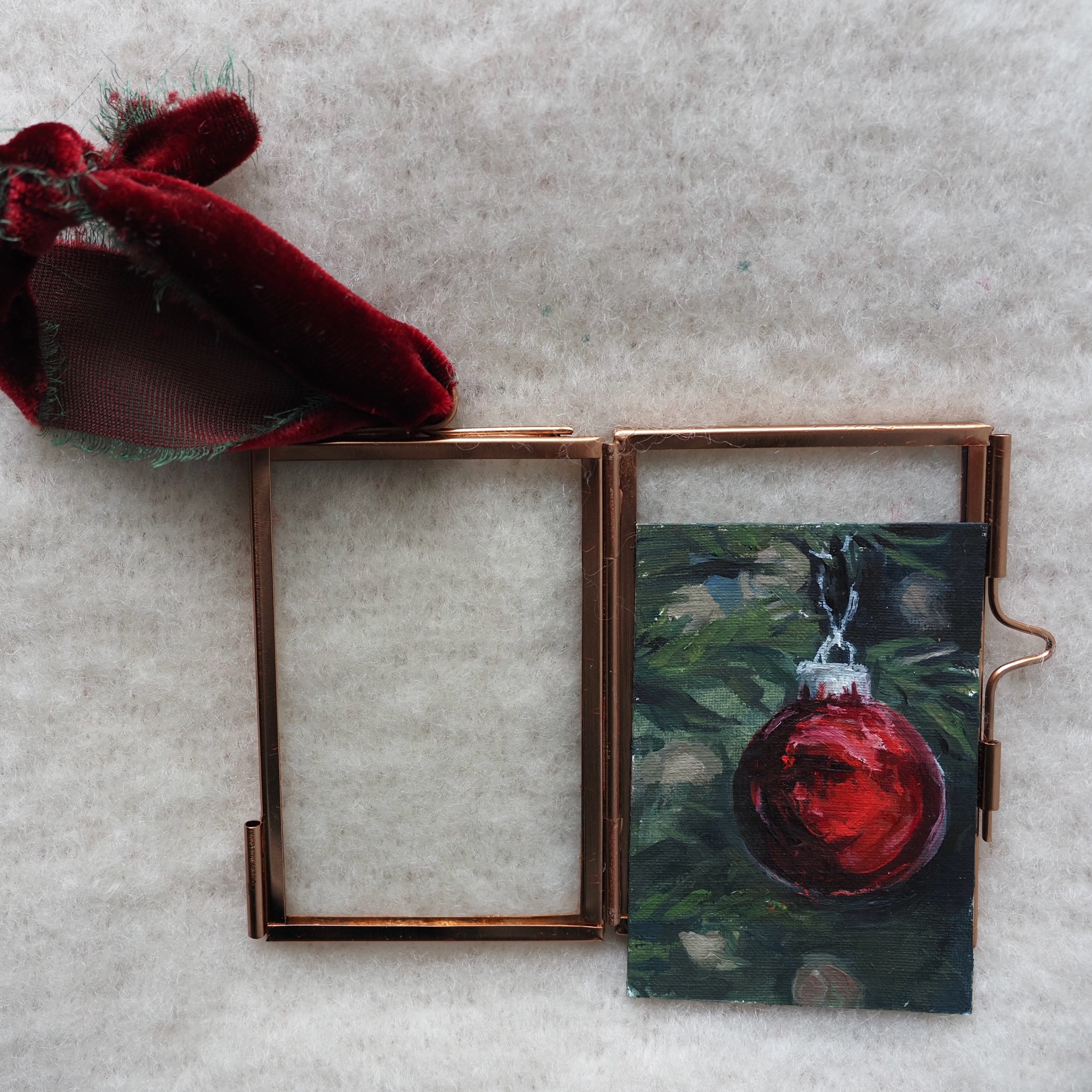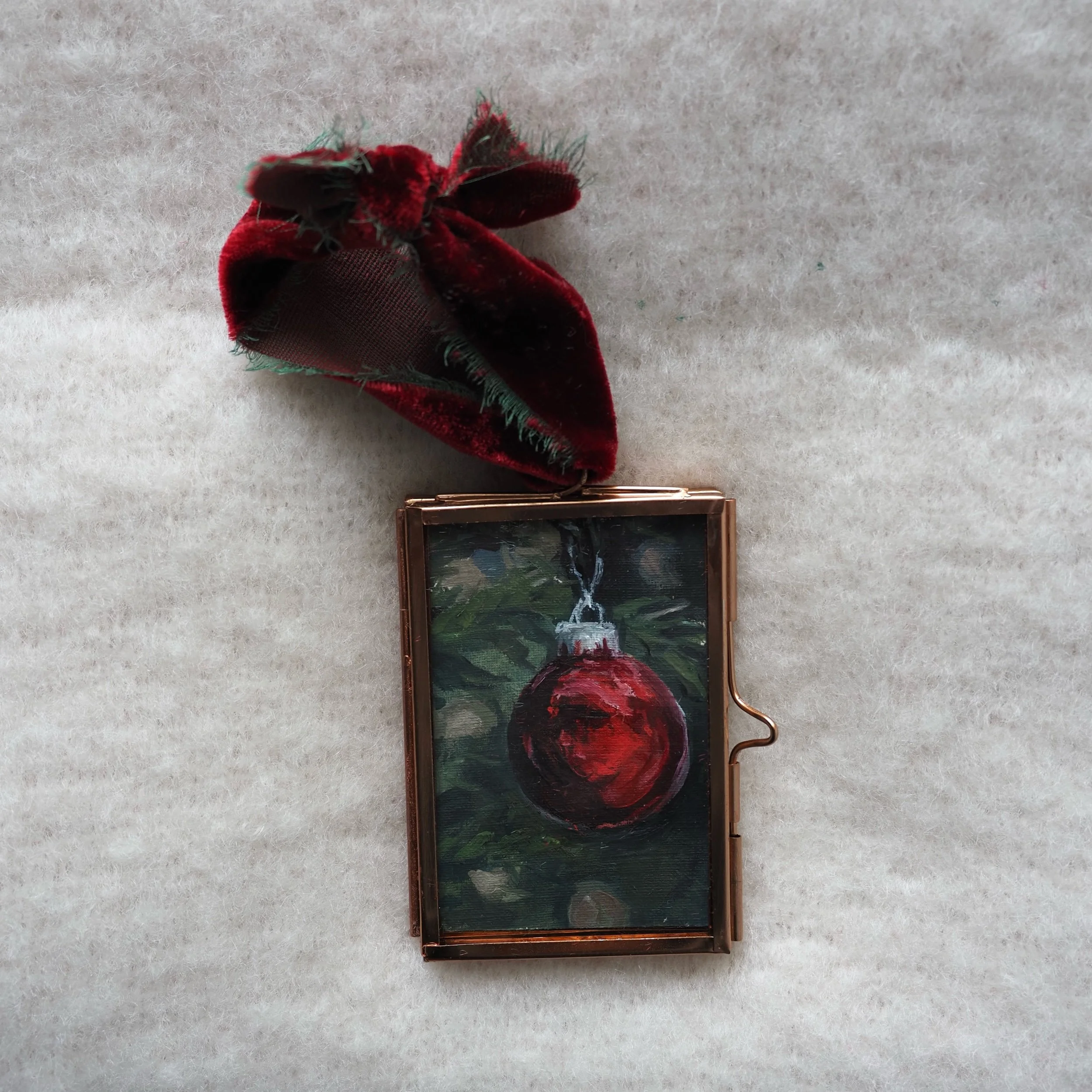 An original 2x3 oil painting of a vibrant red ornament, framed in a copper frame ornament. Finished with a velvet ribbon and signed on the back. Only two available, each unique in slight color and brush stroke variation.